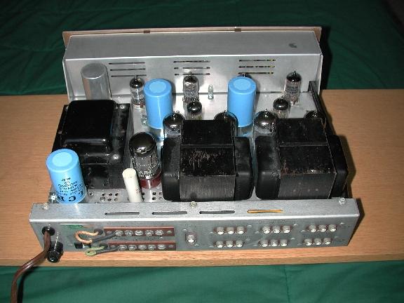Here's my Eico HF-85 with its power supply filtering capacitor rebuilt using the above method. This repair was done in situ, though I don't recommend leaving the electrolytic in the chassis, since you have to solder to the terminals anyway.