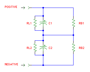 Balance resistors RB1 and RB2 keep the voltage balance between the series capacitors within tolerance by including another larger current in parallel with the leakage current. The balancing current is chosen large enough to overwhelm any leakage imbalance and thereby to guarantee safe operation. To calculate the value of the balancing resistors, first determine the approximate maximum leakage of the series-connected capacitors. The leakage current in uA ranges from 1/5 sqrt(CV) to 1/2 sqrt(CV) according to Nichicon, with C in uF, V in volts and current in uA. You can also get leakage specifications from your capacitor's data sheet. One common rule-of-thumb for the balancing current is 10x the leakage current - thus for two 100uF/350V capacitors connected in series to form a 50uF capacitor, maximum leakage of 1/2 sqrt(100*350) = 94uA, times 10 is about 1 mA. Let's say we want our applied voltage to be 650V, then RB1 and RB2 = 325K ohms. Power dissipation of I*V = 0.325W, so a minimum 1W resistor would give an adequate safety margin. Be sure to check the voltage rating of any balancing resistors too.