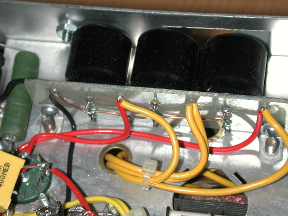 Okay, now for some planning: Since you've cut the leadouts, you'll need to bring wires to the terminals from the new capacitors inside the can. You'll also need to create a new ground connection, since the electrolytics will now be insulated from the can. I start by gluing the capacitors together with a small blob of silicone sealer (RTV) in the orientation they will take when installed in the can. You need to plan the location of the leads so that they can go through the phenolic disk and wrap around the base of the existing terminals. Depending on the lead length, you might have to add some extra wire ... usually I only need to add wire for the ground lead. If you need to stack the new electrolytics inside the can so they'll fit, be sure to insulate all wires from the other wires and the can with spaghetti tubing or heatshrink tubing.