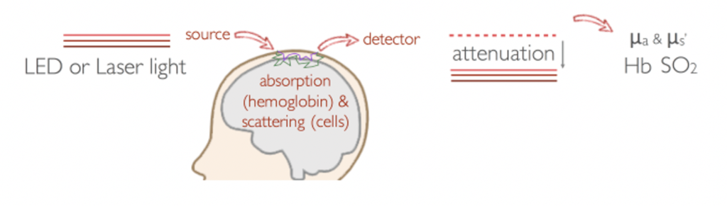 Near-Infrared Spectroscopy (NIRS) measures light attenuation due to absorption of hemoglobin, and from the absorption at two or more wavelengths, it estimates changes in hemoglobin concentration (HbT, or cerebral blood volume (CBV)) and quantifies cerebral hemoglobin oxygenation (SO2).