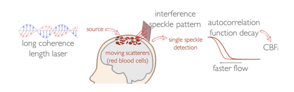 DCS was developed in the ’90s by Dr. David Boas and Dr. Arjun Yodh. Since then, DCS has been widely adopted and its utility is now being tested in several clinical applications. DCS measures how fast coherent light loses coherence because of the movement of red blood cells. The correlation diffusion equation relates the motion of red blood cells in vessels to the temporal autocorrelation decay. Since the correlation decay depends on both the speed of moving red blood cells in the media and on the number of scattering events with the moving particles, which depends on the area of the blood vessels, the slope of the correlation decay is proportional to actual blood flow and not simply flow velocity as in ultrasound methods. By fitting the correlation diffusion equation to the measured autocorrelation we derive a cerebral blood flow index (CBFi, cm2∕s).